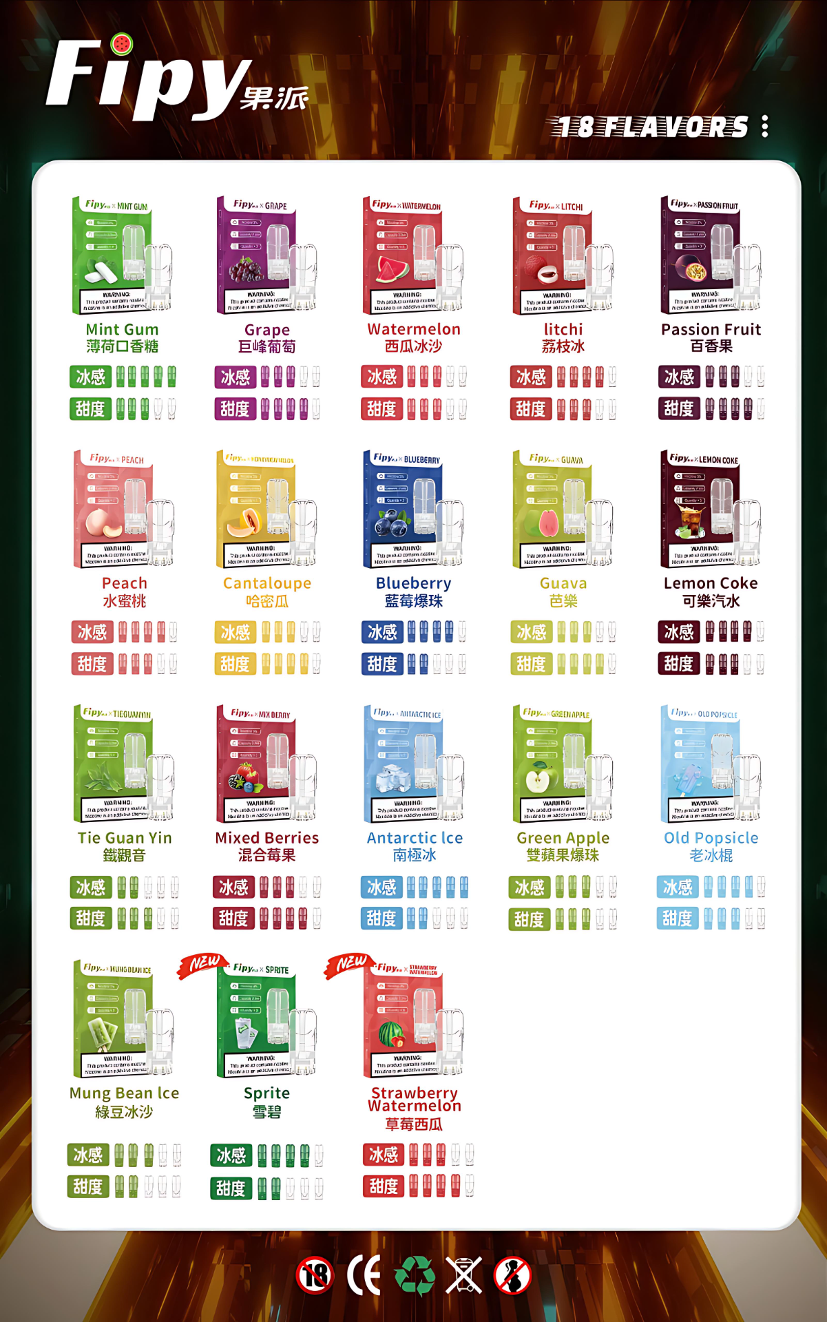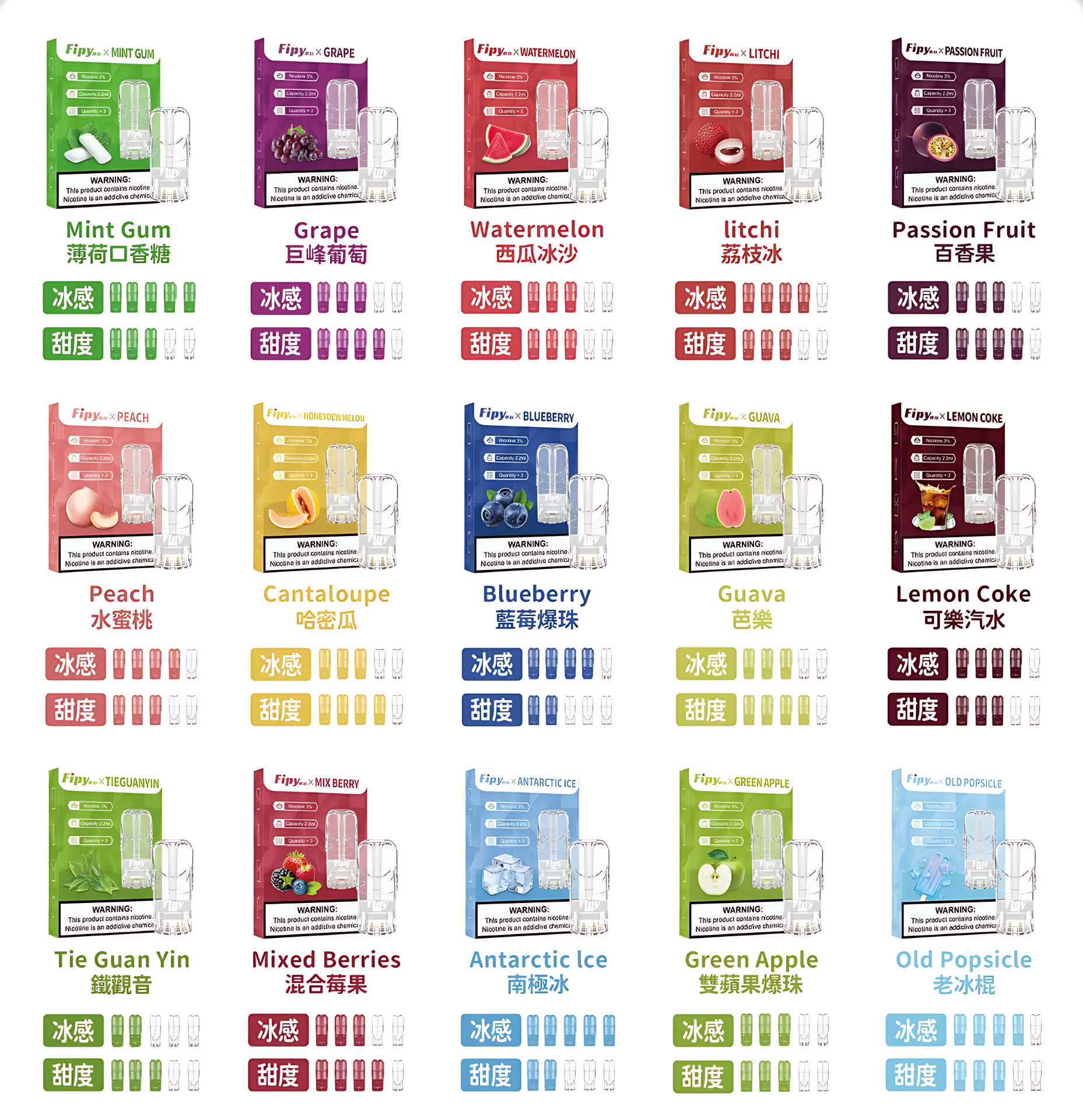 西瓜, 葡萄, 荔枝, 蜜桃, 百香果, 哈密瓜, 芭樂, 藍莓, 混合莓果, 青檸可樂, 南極冰, 綠豆冰沙, 老冰棍, 雪碧, 草莓西瓜, 口香糖薄荷, 青蘋果, 鐵觏音