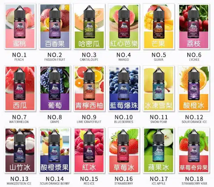 蜜桃, 百香果, 哈密瓜, 红心芭樂, 芒果, 荔枝, 西瓜, 葡萄, 檸檬西柚, 蓝莓爆珠, 雪茄菸草, 經典菸草, 草莓冰, 蘋果冰, 草莓奇異果, 红牛, 薄荷, 水果養樂多, 莫吉托/雞尾酒, 红酒冰, 檸檬氣泡酒, 可樂, 冷萃龍井, 烏龍茶, 老冰棍, 荔枝缘茶, 茉莉花茶, 檸檬茶, 冰雪梨, 鳳梨椰子