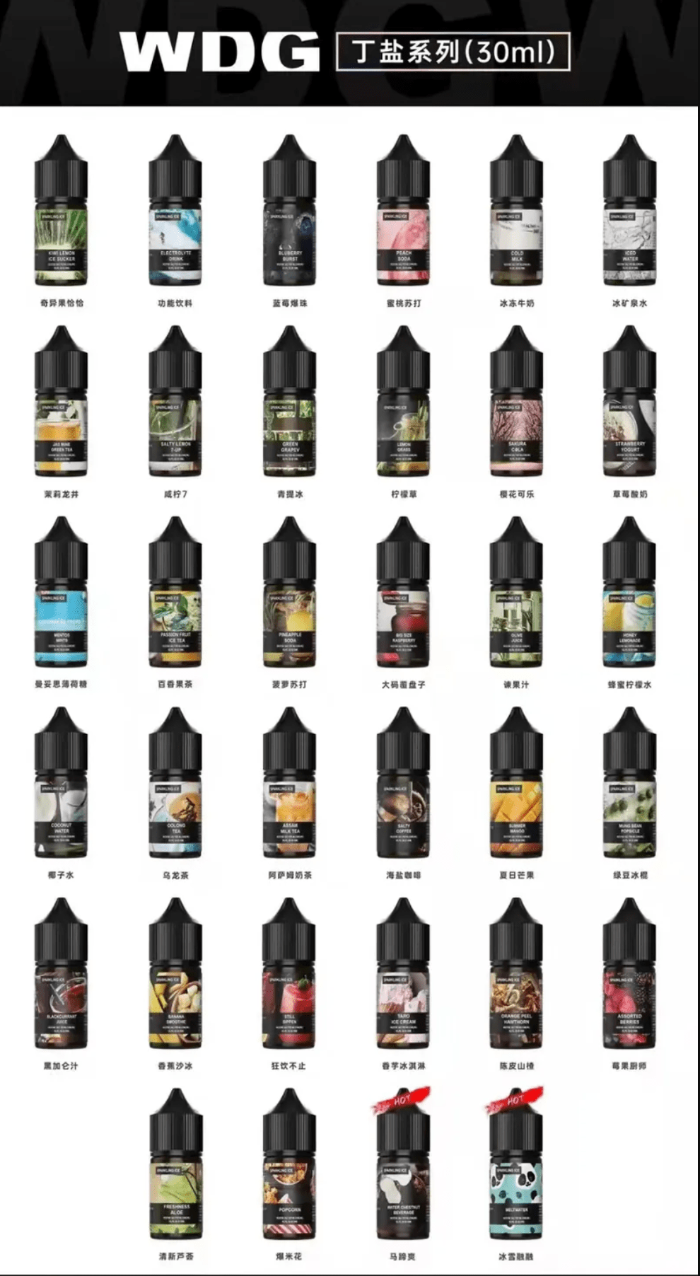 • 多樣化口味 :WDG 煙油擁有多款創新的口味,如 Fresh Berry(新鮮莓果)、Vanilla Custard(香草奶油)、Tobacco Menthol(薄荷煙草)、奇異果恰恰果、阿薩姆奶茶、咸寧 7、冰礦泉水、蜜桃蘇打等,無論是水果風味、甜品口感還是煙草香氣,都能滿足不同人的偏好。